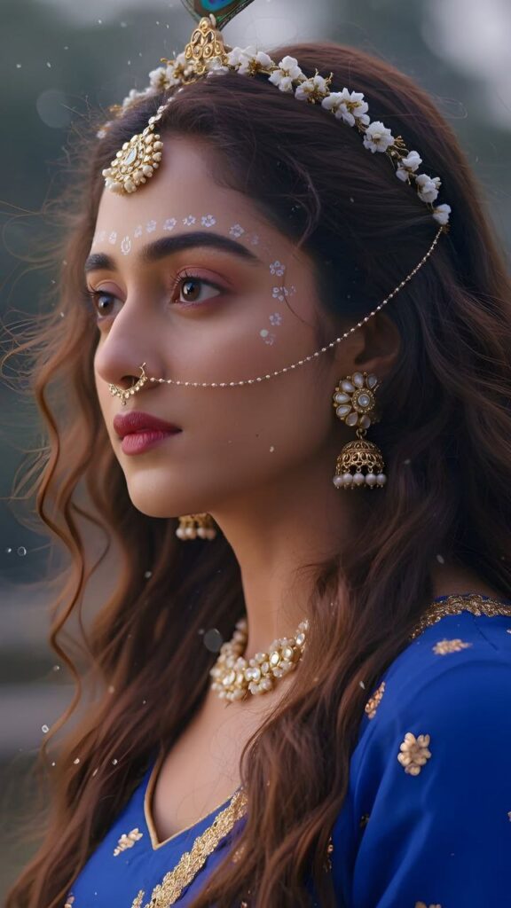 A beautiful Indian woman dressed in a royal blue saree with golden embroidery, wearing traditional bridal jewelry including a maang tikka, pearl nose ring with chain, jhumka earrings, and pearl choker necklace. Her long wavy hair is decorated with a floral crown of pink and white flowers. She has elegant makeup with bold lipstick and expressive eyes, with delicate white forehead designs. Captured outdoors in soft natural light, ultra realistic, 8k, cinematic portrait, highly detailed, photorealistic style.