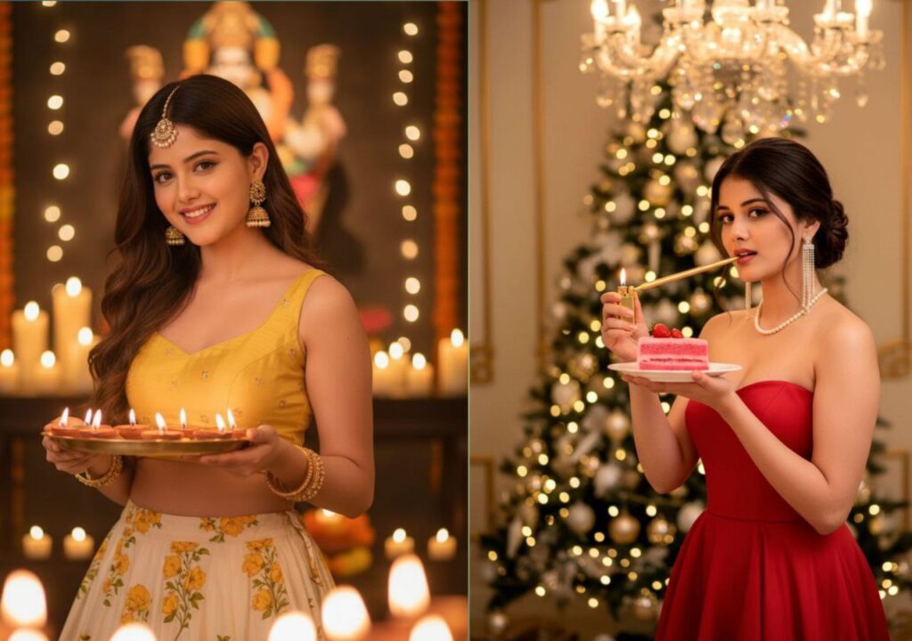 A beautiful young Indian woman in traditional festive attire, wearing a yellow stylish sleeveless blouse and a cream lehenga with bright red floral prints., holdinga decorated brass thali filled with lit diyas (oillamps) in both hands. Her head is slightly tilted, with a gentle smile and expressive eyes looking towards the camera. She has long wavy hair styled to one side, adorned with a maang tikka, earrings, and golden bangles. The background features warmglowing fairy lights, candles, and a blurred Radha Krishna idol, creating a devotional festive vibe. Foreground bokeh of glowing diyas adds depth. Cinematic photography, soft warm lighting, high detail, professional portrait style. For making this photo use the above photo and don’t change her face it should be exact same 100%
